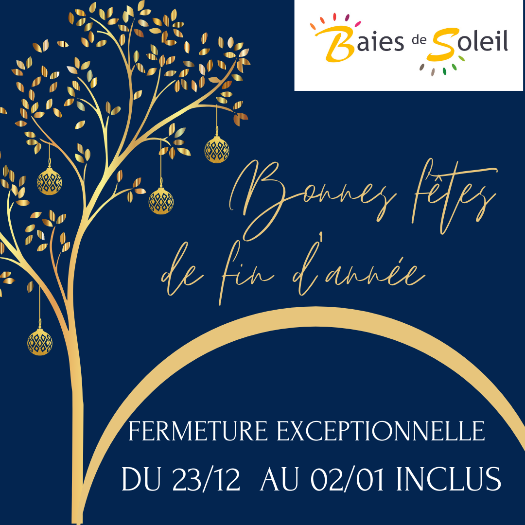 Toute l'équipe Baies de Soleil s'arrête pour quelques jours afin de profiter des fêtes de fin d'année ! Nous serons en congés du vendredi 22 décembre fin de journée au lundi 2 janvier inclus. Nous tenons à remercier notre aimable clientèle qui nous a fait confiance et nous espérons aborder la nouvelle année ensemble, afin de construire, avec vous, de nouveaux projets !