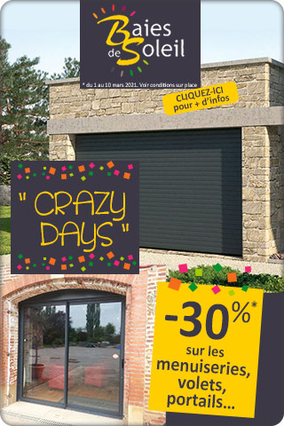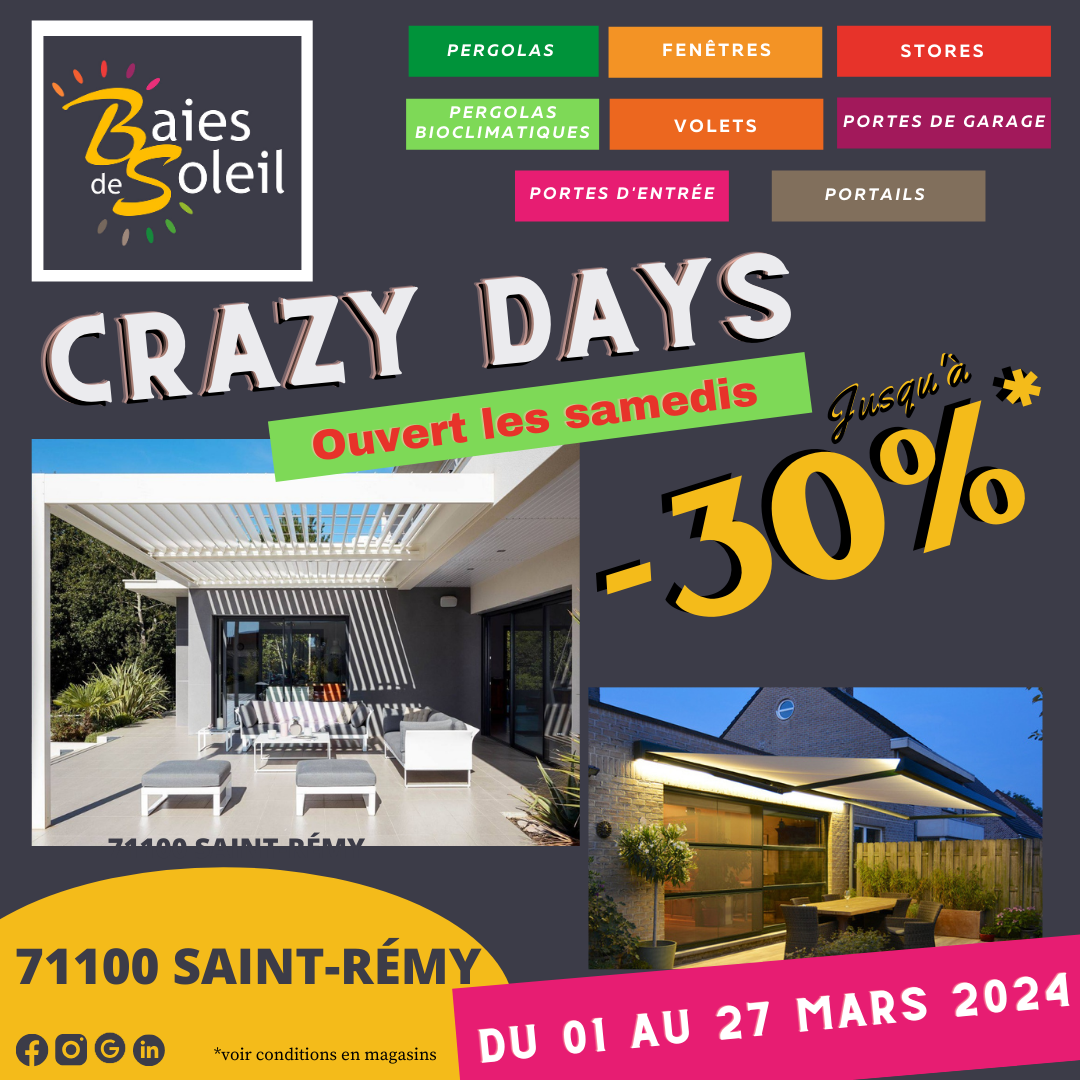 Avec les beaux jours, tout devient plus fou chez Baies de Soleil ! Du 7 au 16 mars, venez profiter des Crazy Days ! Jusqu'à 20% de remises sur vos projets !! Pergolas, stores et fenêtres, portes et portails, volets… Ouverture spéciale dimanche 13, mais attention, quantités limitées !