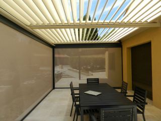 Vous avez la possibilité d'agrémenter votre pergola de stores en périphérie pour la protection du soleil , mais aussi pour profiter plus longtemps de votre terrasse à la mi saison (ou vous protéger du vent par exemple) ! La pergola Bioclimatique Solisysteme est vraiment la solution optimale ! et vous pouvez aussi jouer avec la lumière le soir venu pour profiter de vos soirées entre amis: éclairage LED pour voir clair dans votre assiette, ou éclairage feutré et Led RGB pour diffuser une lumière d'ambiance !